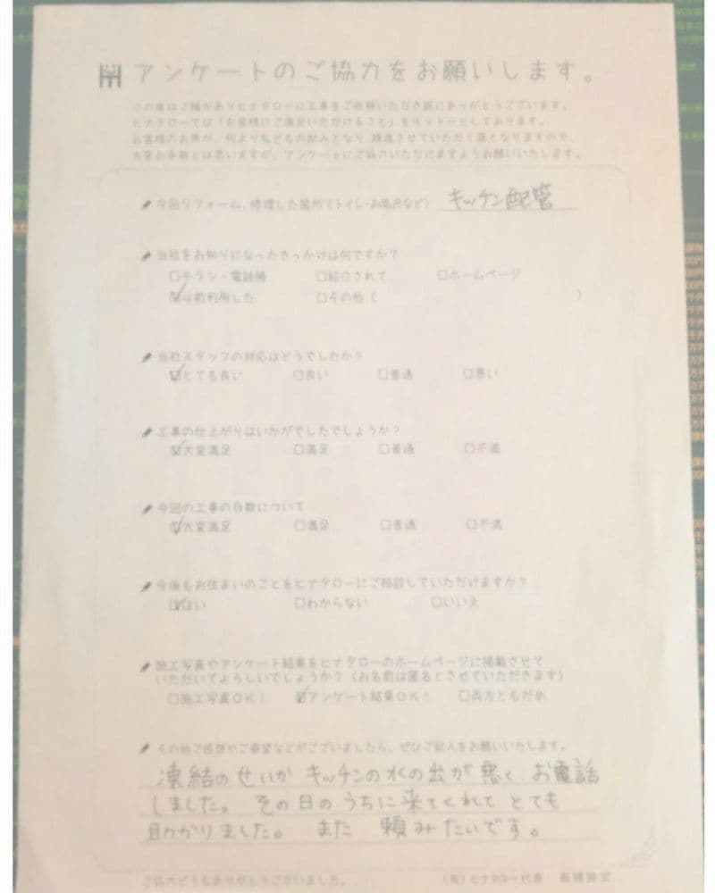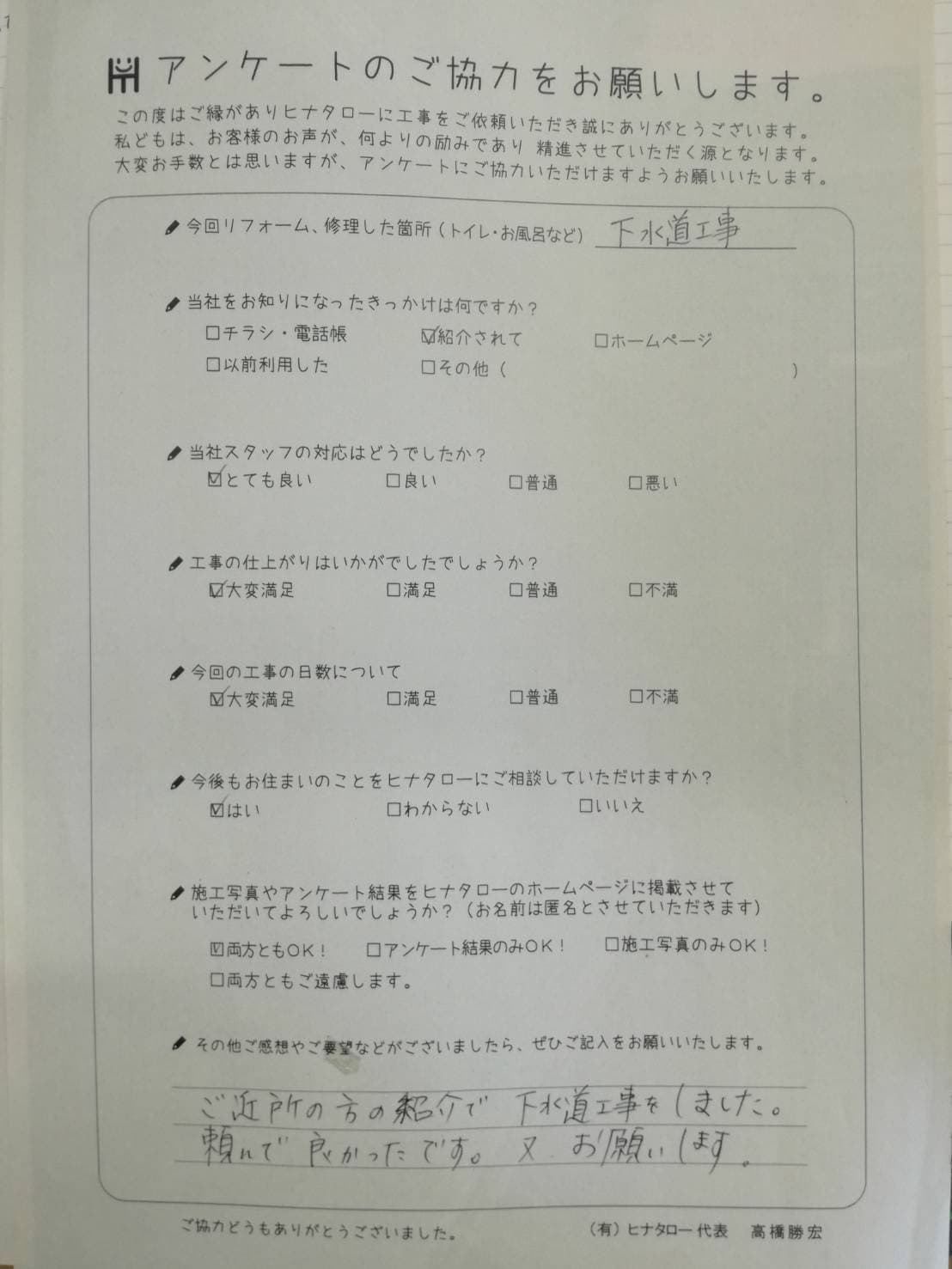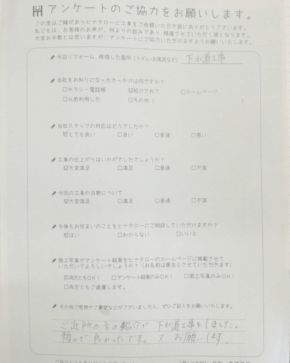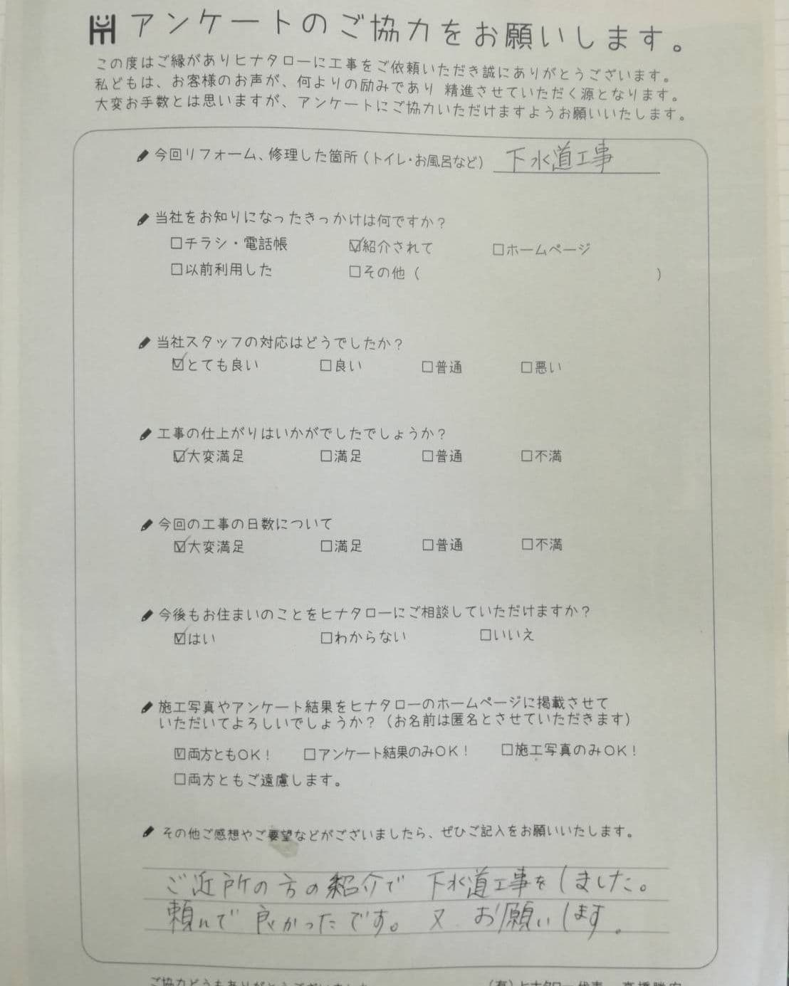 下水道工事をお願いしたところ、見積書から着工までスムーズで大変満足しています。 |